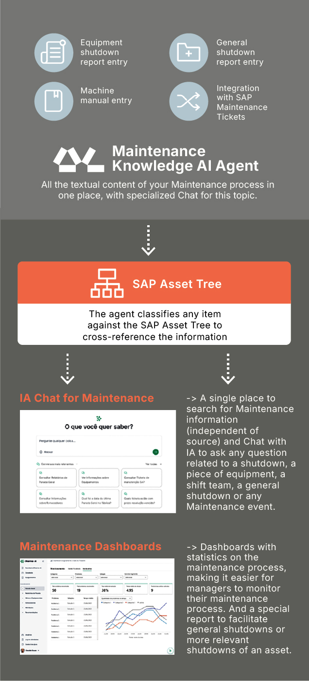 -> Much progress has been made in sensors (IoT or IIoT) and the use of failure prediction algorithms (Machine Learning). However, the textual knowledge of operation and the real day-to-day of Maintenance still remains siloed and disconnected in most large continuous production lines.